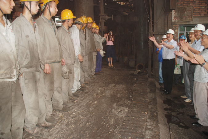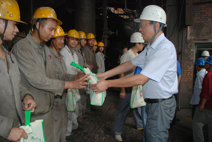 2013年7月12日上午,縣上領導宋興東、陳小康、趙文哲、陳明華、李鈞等帶領送清涼慰問組來公司對一線職工進行了慰問。上午十時,慰問小組來到了正在出鐵的二號高爐現場,為爐前工送上了綠豆、茶葉、白糖等防暑降溫用品,勉勵職工堅守崗位,戰勝酷暑,為確保生產順行做出貢獻。