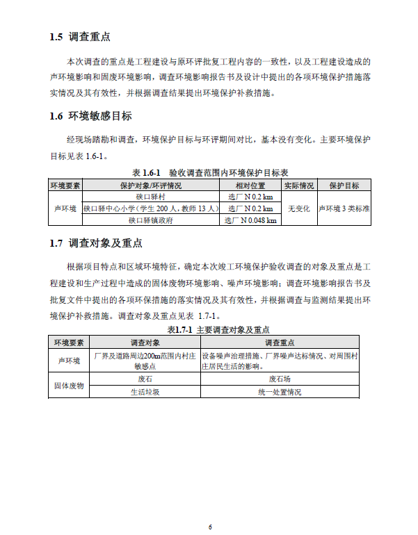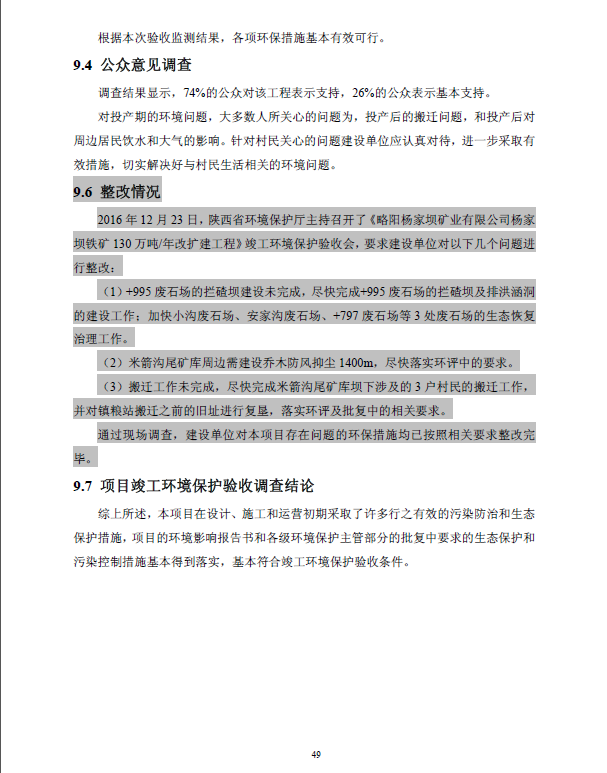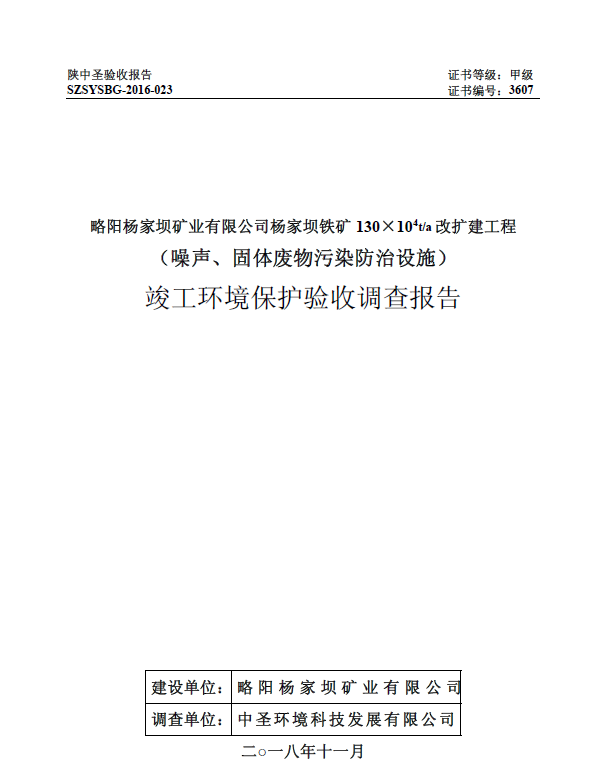 根據建設項目竣工環境保護驗收管理有關規定要求,為進一步加大環境信息公開力度,推進公眾參與,維護公眾環境權益,由中圣環境科技發展有限公司承擔的《略陽楊家壩礦業有限公司楊家壩鐵礦130×104t/a改擴建工程(噪聲、固體廢物污染防治設施)竣工環境保護驗收調查報告》已編制完成,全本公示見附件,公眾可查閱報告全本內容,提出反饋意見。自公示即日起10個工作日內,公眾可通過電話、信件、電子郵件等方式與建設單位聯系,發表對該項目竣工環境保護驗收調查報告的意見或建議。